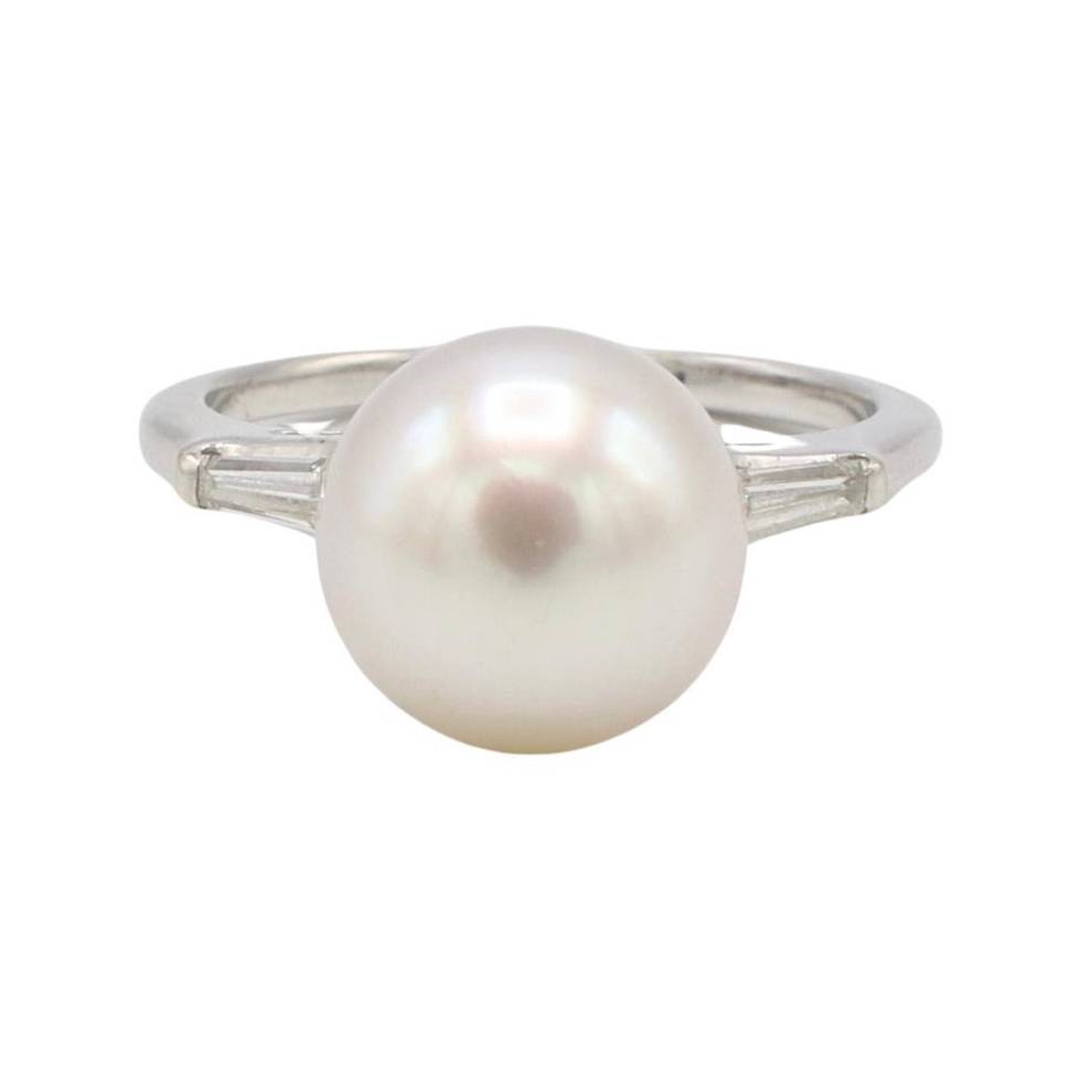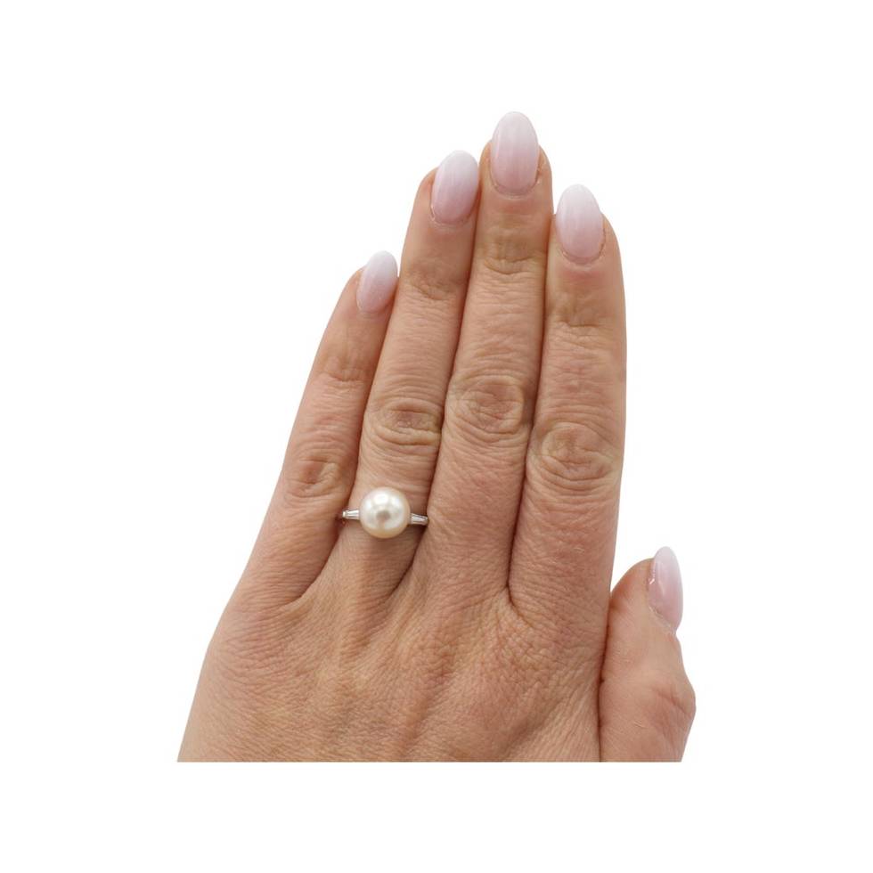 This sophisticated cocktail ring features a high-luster Akoya cultured pearl accented by a delicate halo of natural diamonds. The 9.5mm x 11mm silhouette balances the pearl’s organic curves with the sharp brilliance of the surrounding stones. A timeless pairing of 14K white gold and maritime elegance.