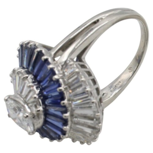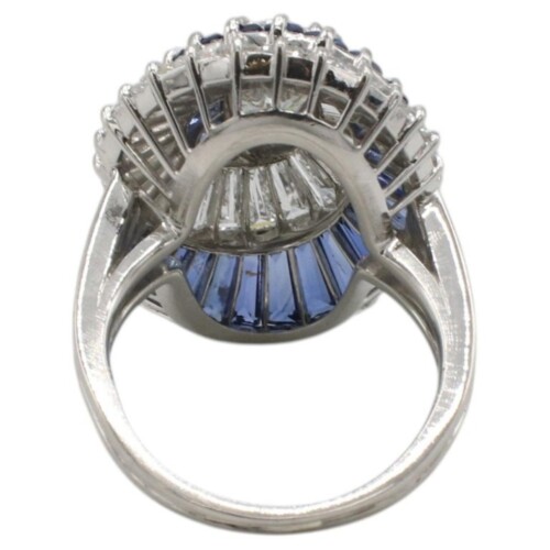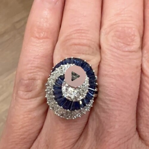 This striking designer piece features a bold dome silhouette adorned with vibrant blue sapphires and sparkling natural diamonds in an elegant swirling pattern. Expertly crafted with exceptional attention to detail, it’s a timeless statement ring perfect for any fine jewelry collection.