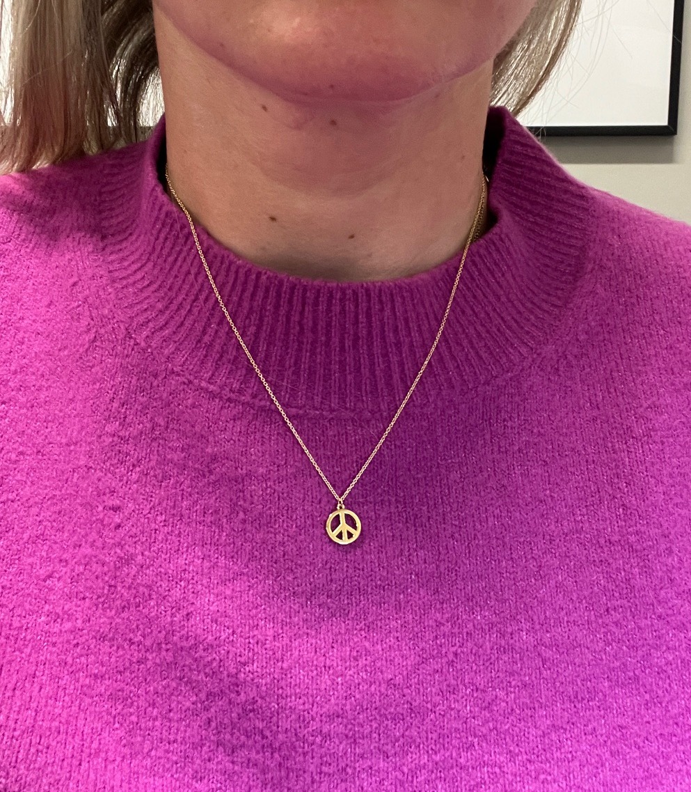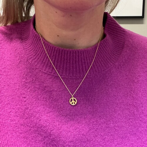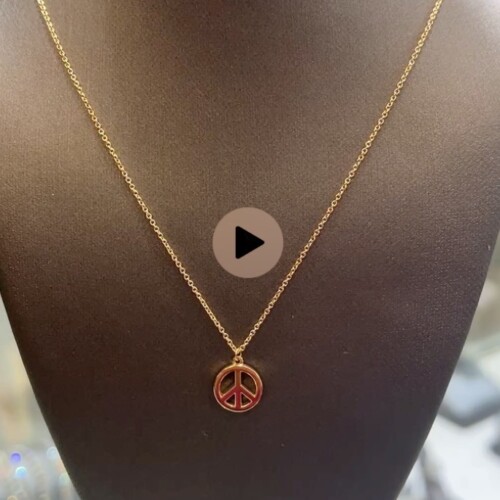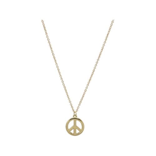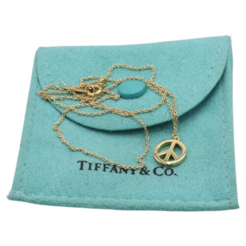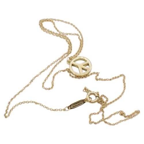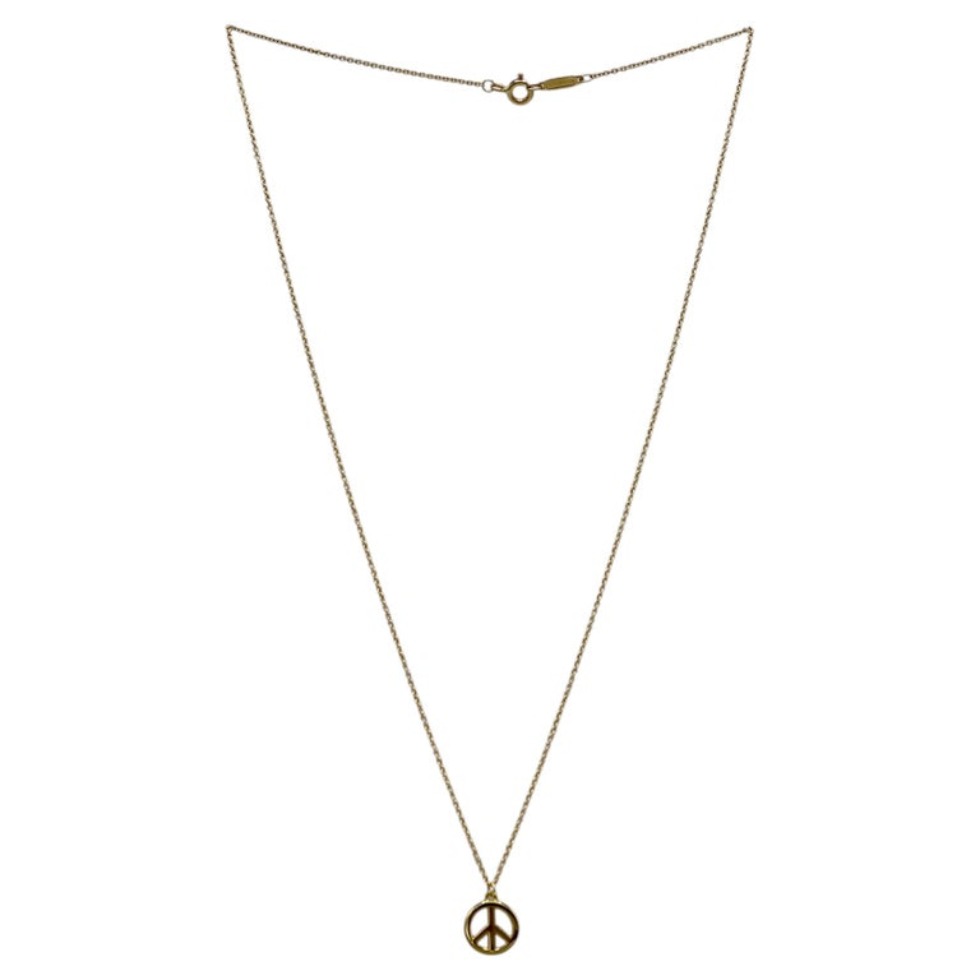Classic and meaningful, this Tiffany & Co. 18 karat yellow gold peace sign pendant necklace embodies timeless style with a symbolic touch. Suspended from a delicate chain, it offers effortless elegance and a refined statement for everyday wear or layering.