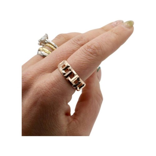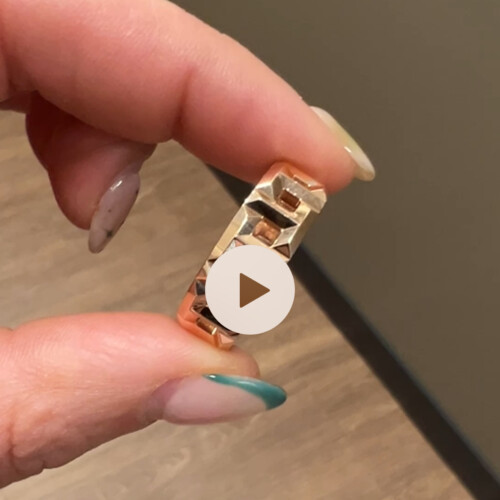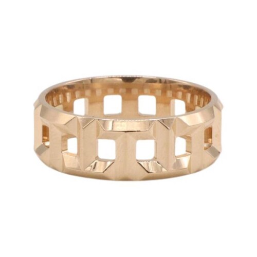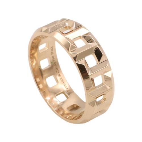 This wide 18K rose gold band features an interlocking “T” motif, a bold and architectural expression of the Tiffany T collection. At 8mm wide and 9.40 grams, it’s a substantial, gender-neutral piece that embodies modern luxury.