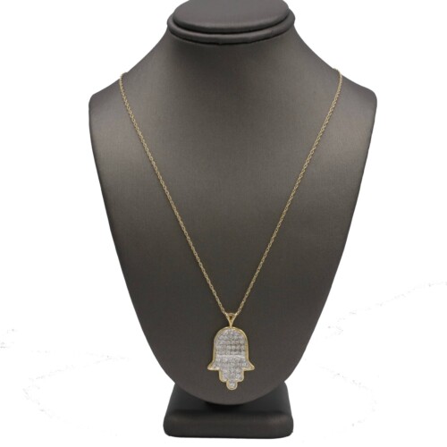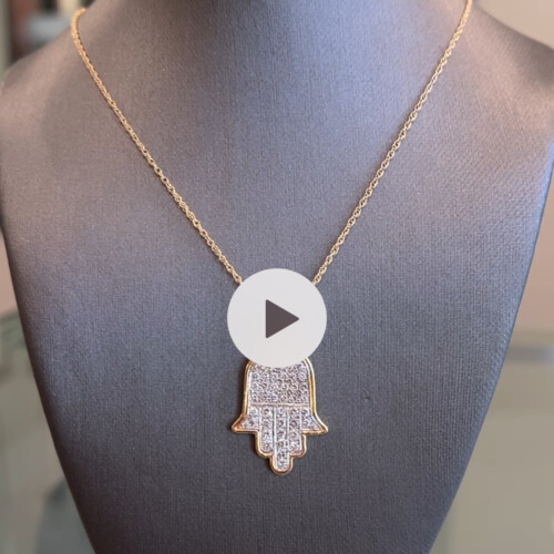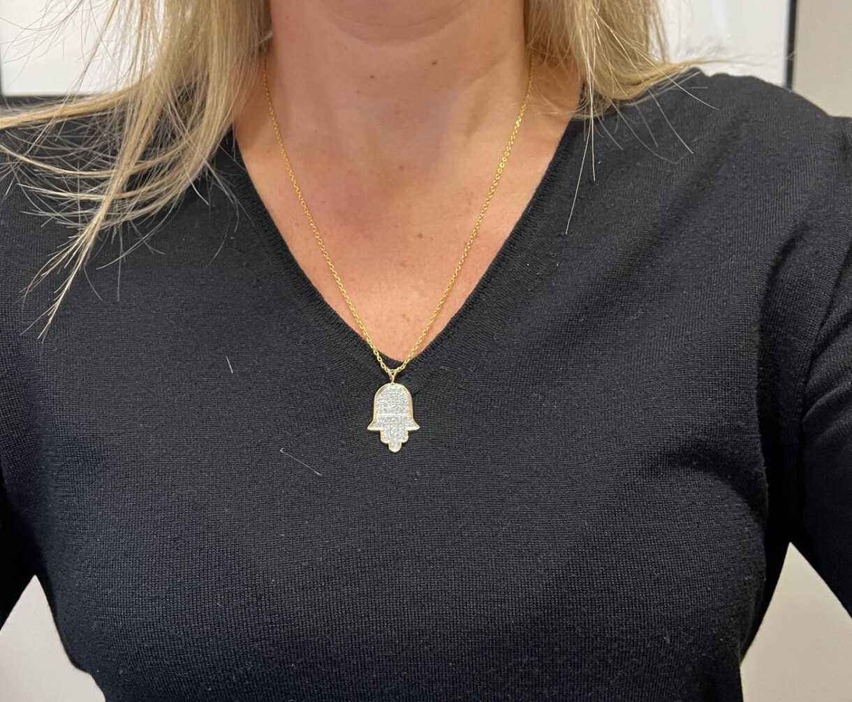 A symbol of protection and luck, this 14K yellow gold Hamsa pendant is set with round natural diamonds. The intricate 2.95-gram piece hangs from an 18-inch chain, blending spiritual heritage with timeless luxury.